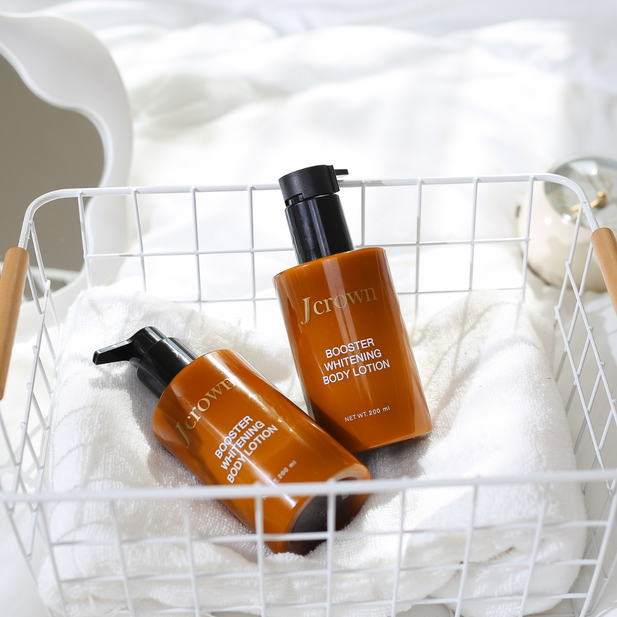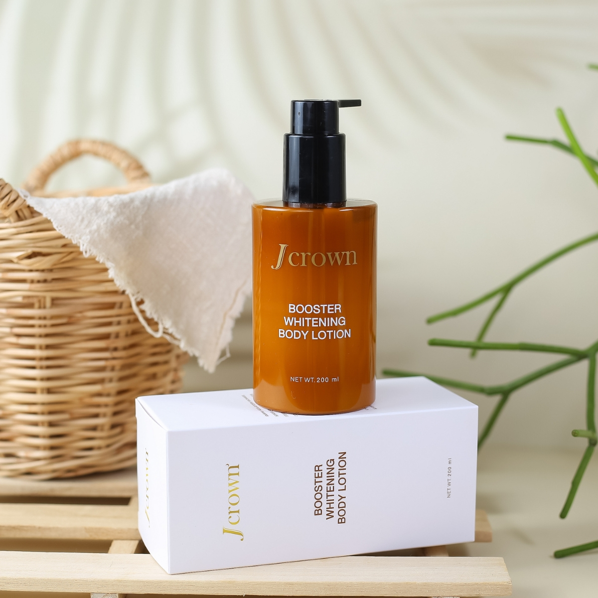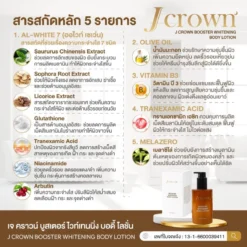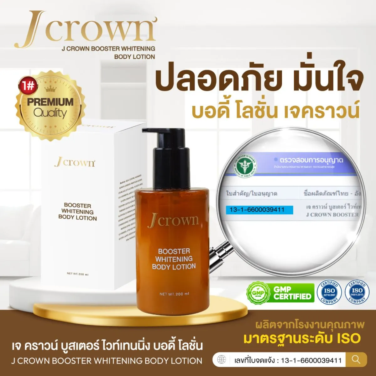 โลชั่นบำรุงผิวกาย J CROWN BOOSTER WHITENING BODY LOTION เหมาะสำหรับทุกสภาพผิว อุดมไปด้วยคุณค่าจากธรรมชาติจากสารสกัดจาก 7 ชนิด ที่ช่วยบำรุงผิวให้กระจ่างใสอย่างมีประสิทธิภาพ ปราศจากสารเคมีอันตราย อ่อนโยนต่อผิว